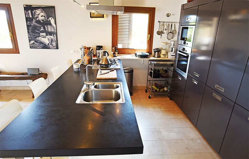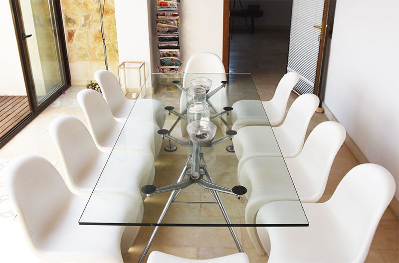 You can have a fast breakfast at the kitchen countertop. In the conservatory, at the grand table, you can seat ten people for dinner with a view. Of course most of the time you will eat at the large table outside.