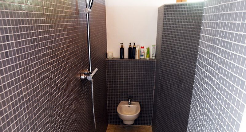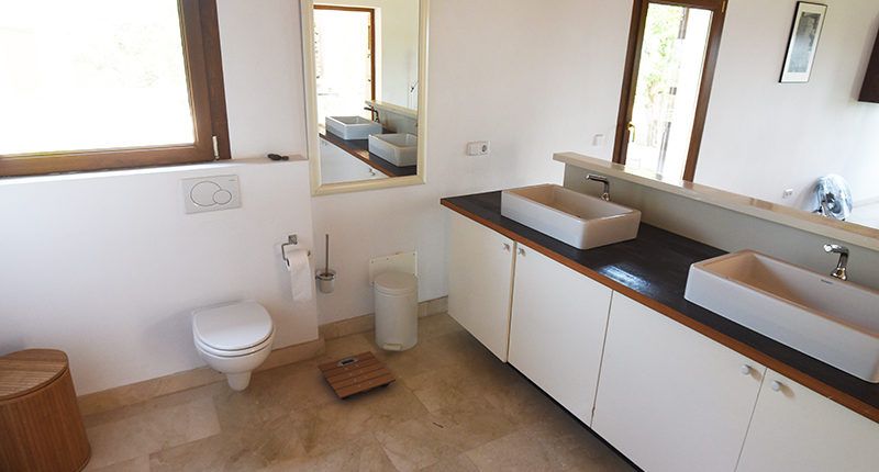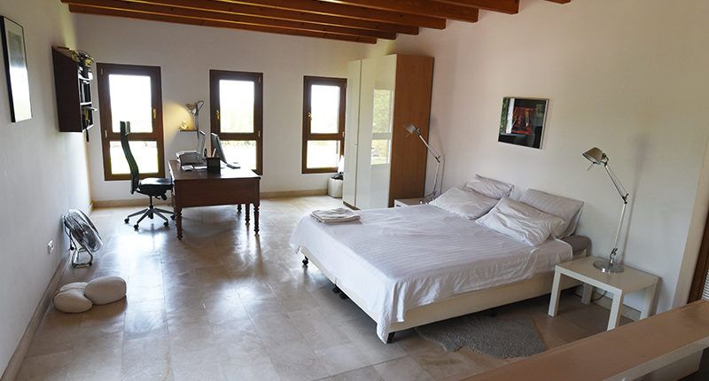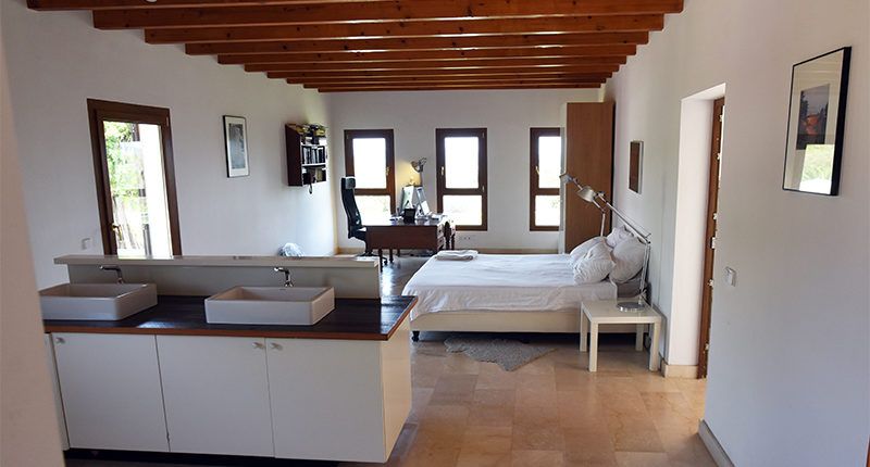 The master bedroom is a 44 square meter loft with an open bathroom. The extra long kingsize bed (also possible as twin) is probably the best bed of the island.